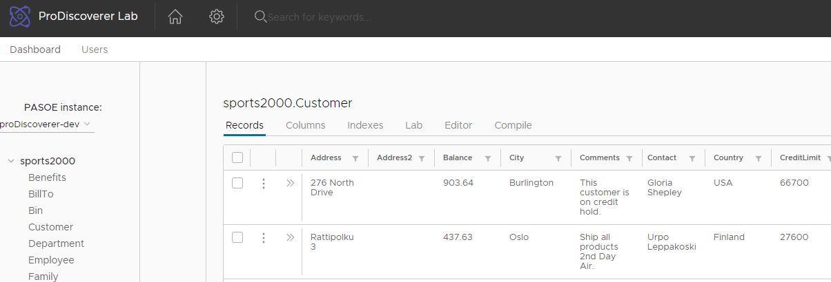 Select PAS instance -> Database -> Table -> Lab | Editor tabs: